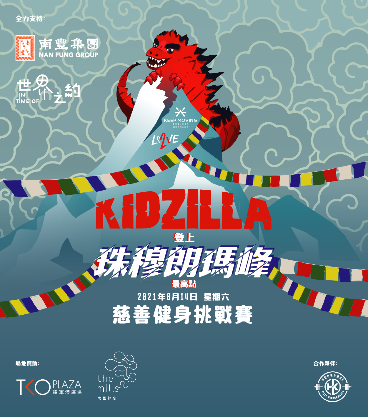 由躍動無限基金會及LOVE 21 Foundation 舉辦,南豐集團、世界之約、The Mills 南豐紗廠及將軍澳廣場全力支持KIDZILLA vs EVEREST – Fundraising for Love 21 Foundation,約定大家一起協力完成挑戰珠穆朗瑪峰的創舉,籌款支持 Love 21 Foundation 的唐氏綜合症和自閉症患者,讓他們得到充分發揮其潛力的機會。